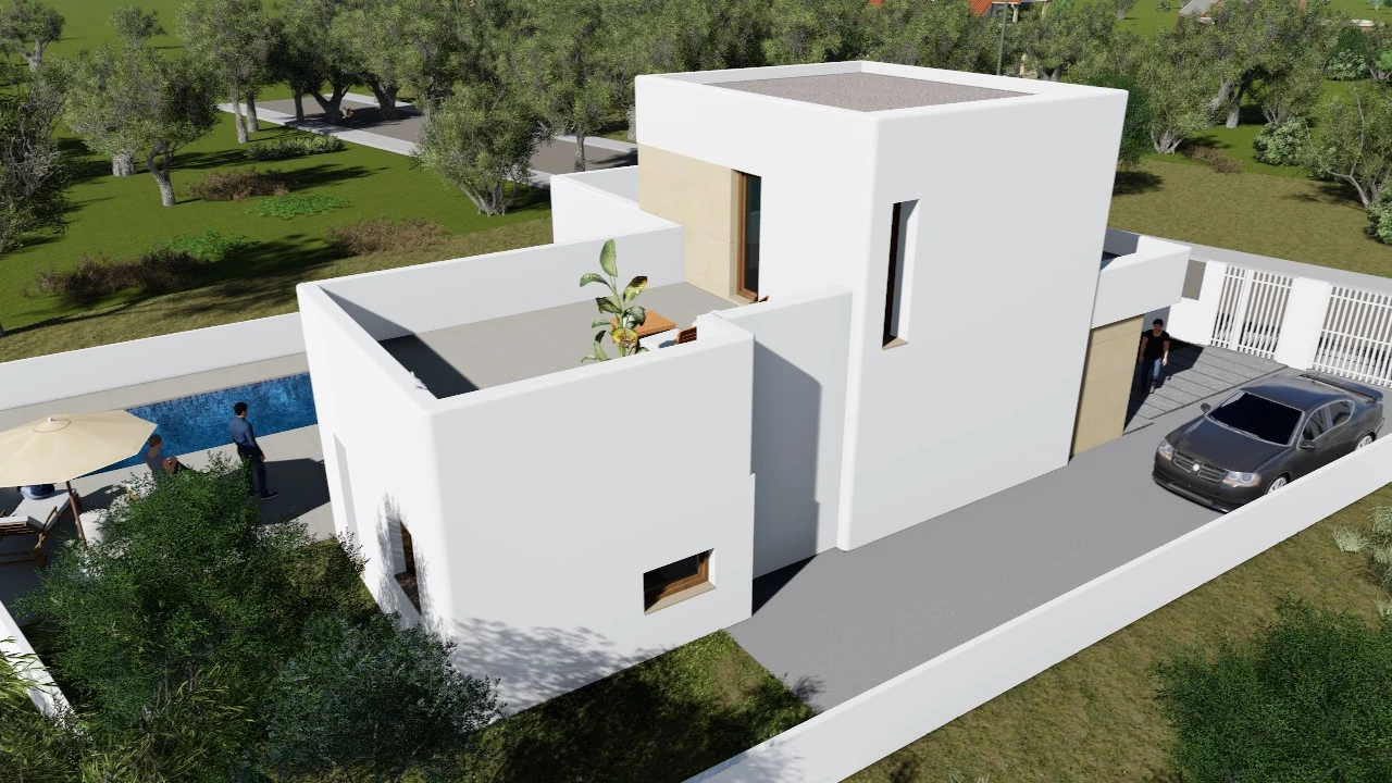 Esta vivienda unifamiliar se compone de volúmenes blancos y compactos, dispuestos en distintas alturas para articular el espacio exterior y la piscina. Su diseño juega con la geometría y la orientación para generar una relación fluida entre interior y exterior, combinando sencillez formal con funcionalidad. La materialidad, basada en acabados lisos y carpinterías de madera, aporta un carácter mediterráneo y atemporal, integrándose con naturalidad en el entorno ajardinado que la rodea.